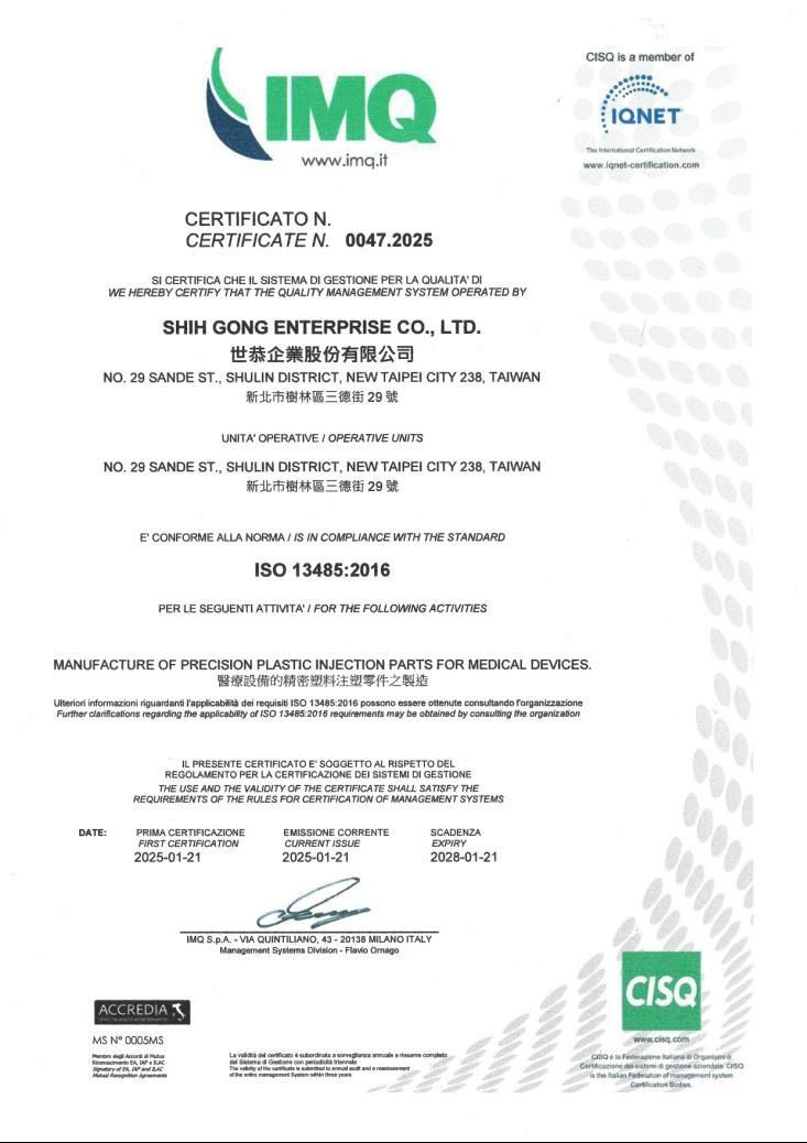Shi Gong Enterprise Achieves ISO 13485:2016 Medical Device Certification